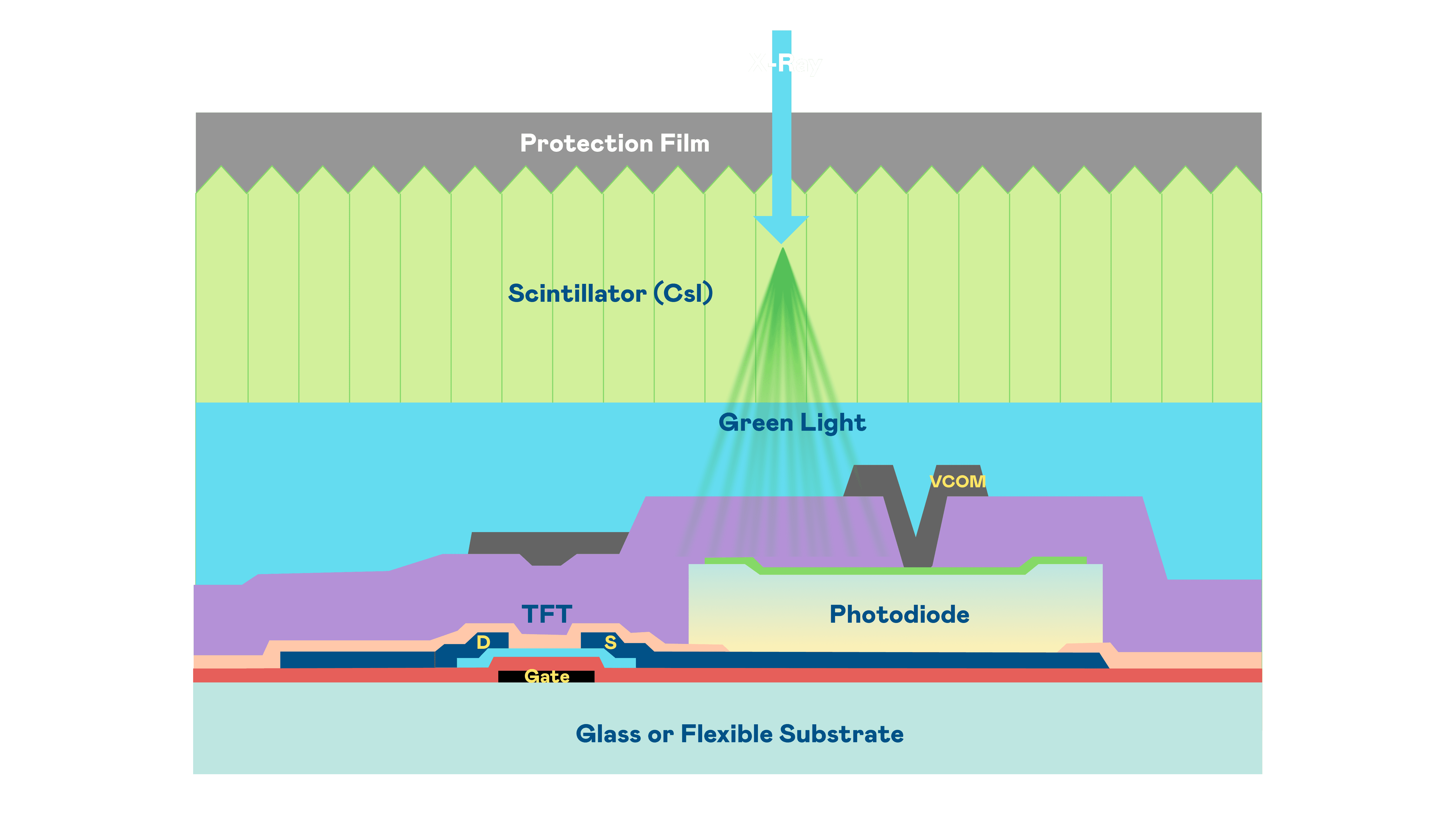 龙门国际的X光影像感测阵列使用薄膜电晶体 (TFT) 作为每个像素的读取开关,,,,搭配光电二极体(Photodiode)的光电转换元件,,用以感测X光影像讯号。。
