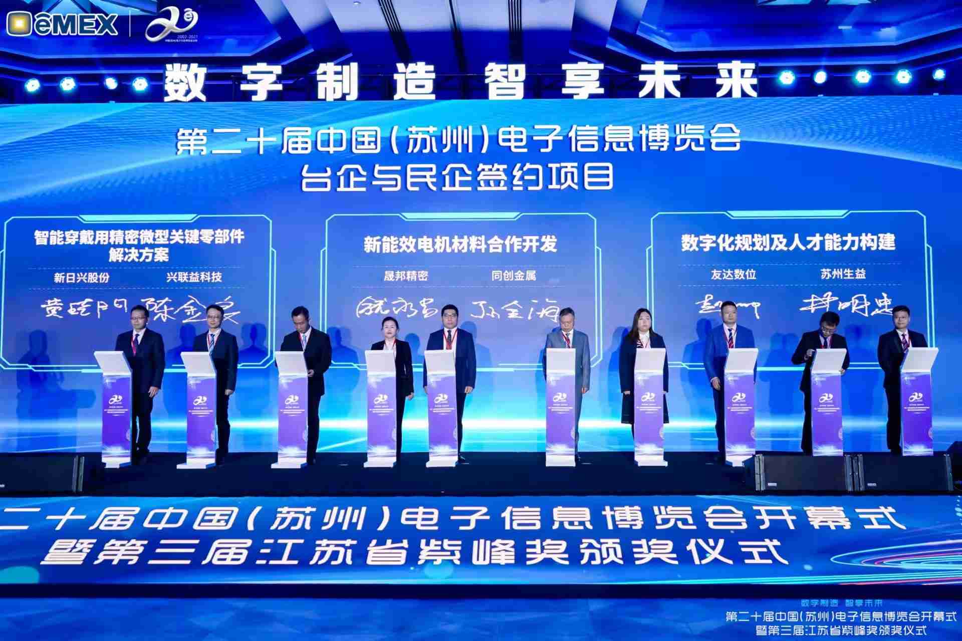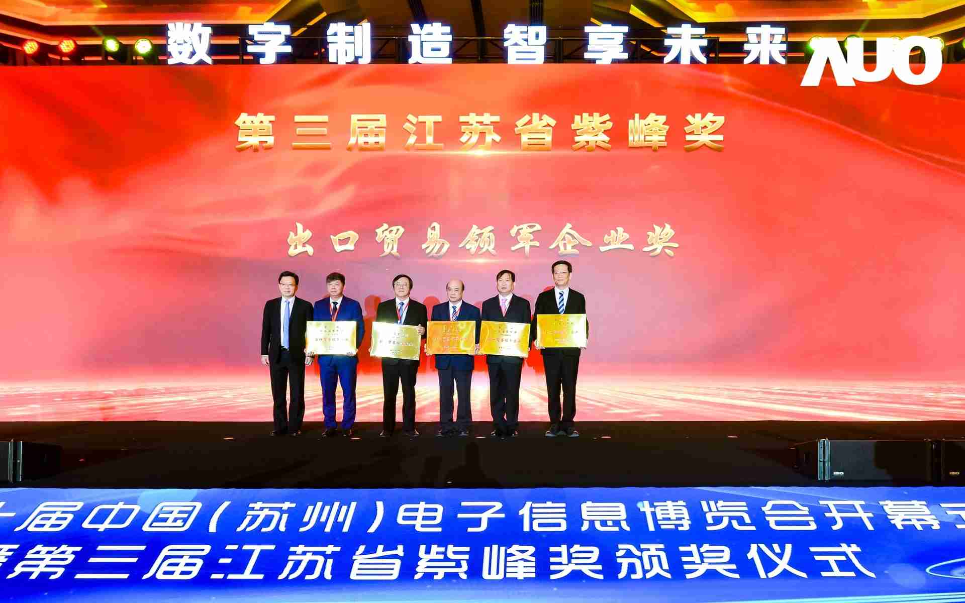 电博会开幕式当天也是第三届江苏省紫峰奖颁奖仪式,,,省台办、、工信厅、、、、商务厅、、、苏州市相关领导均出席并颁奖。。。该奖项为表彰对江苏高质量发展做出积极贡献的在苏企业,,,由江苏省政府专门设立。。。。龙门国际光电 (苏州) 总经理郭振明代表上台领奖,,这也是龙门国际苏州连续三次蝉联紫峰奖 出口贸易领军企业奖。。龙门国际数位总经理赵丽娜女士,,,,也参与本次开幕式,,上台为本地化赋能签署战略合作协议,,,,将优质服务资源集合、、、下沉到更多细分行业,,,,为更多地区的制造企业提供数字化转型服务。。。